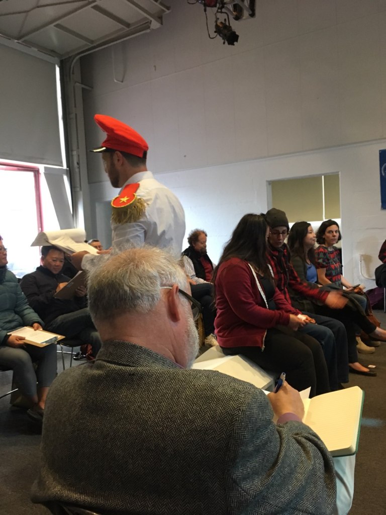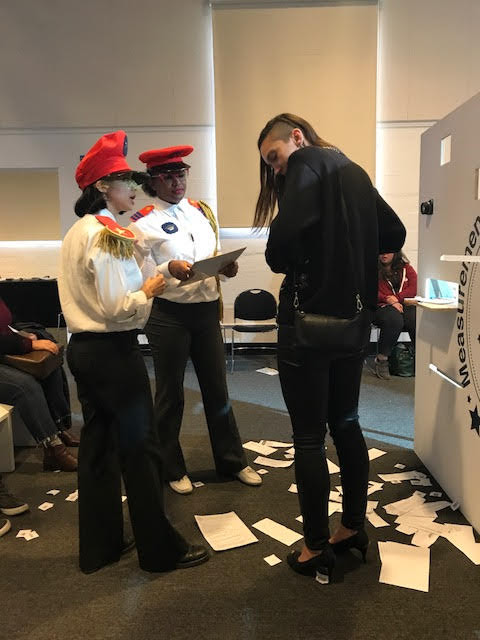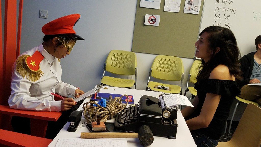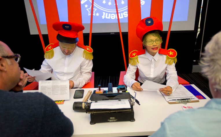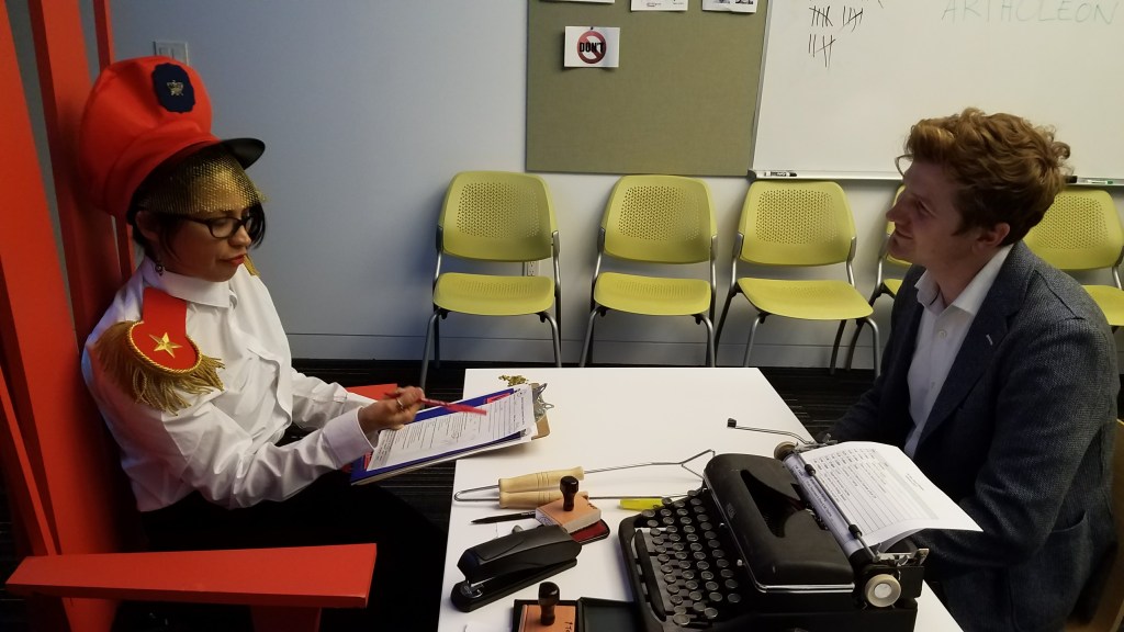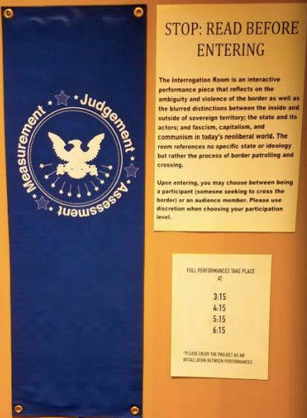 An immersive performance that examines the power dynamics of borders, border crossing, and bureaucratic space. Potential audience members choose roles as either participants or spectators as varied groups seek to gain citizenship in the mythical kingdom of Samchriavad. Part absurdist parody, part trenchant critique, the action takes place in Samchriavad’s citizenship processing center. The Interrogation Room follows the challenges surrounding entry to or membership in a new space, questioning the limits of human cruelty, resilience, and compassion.
