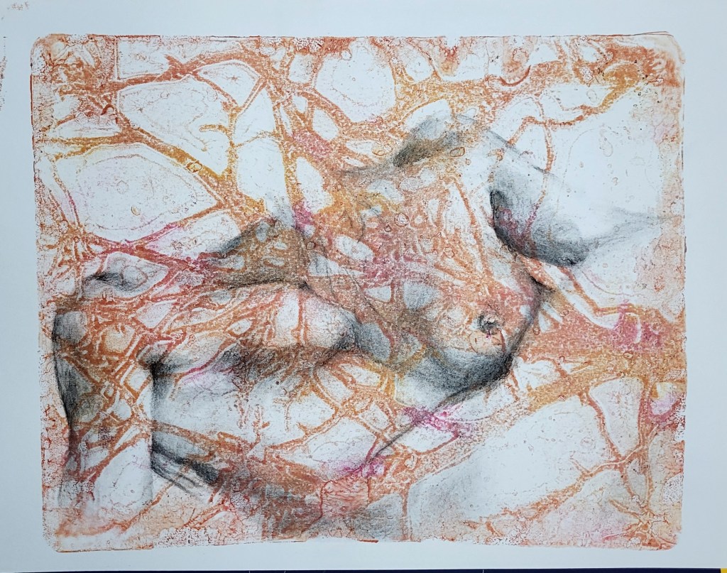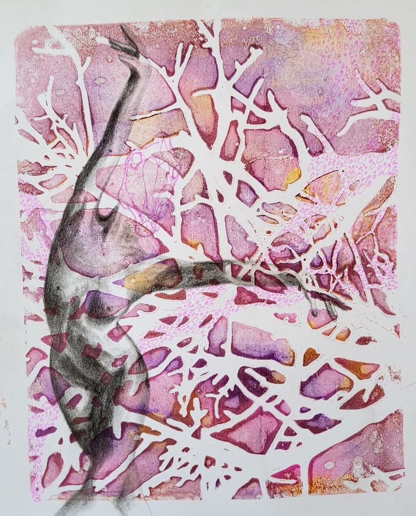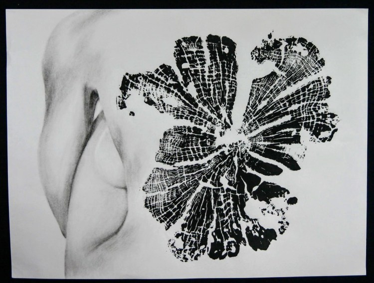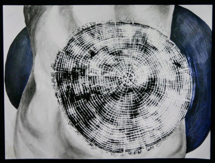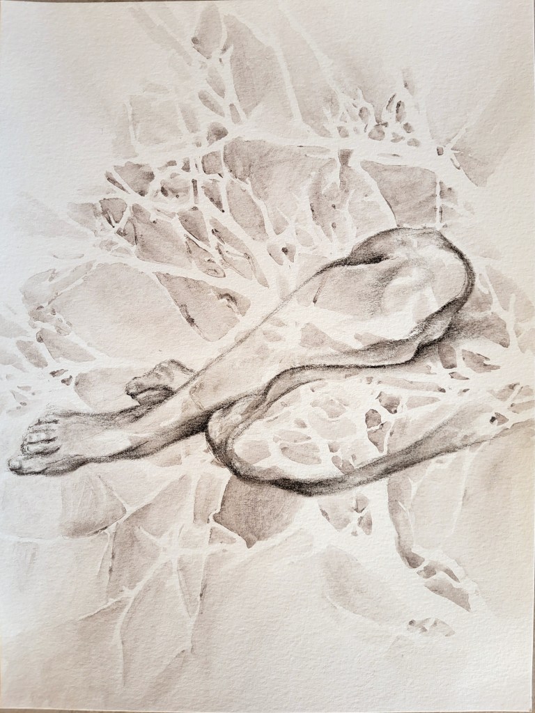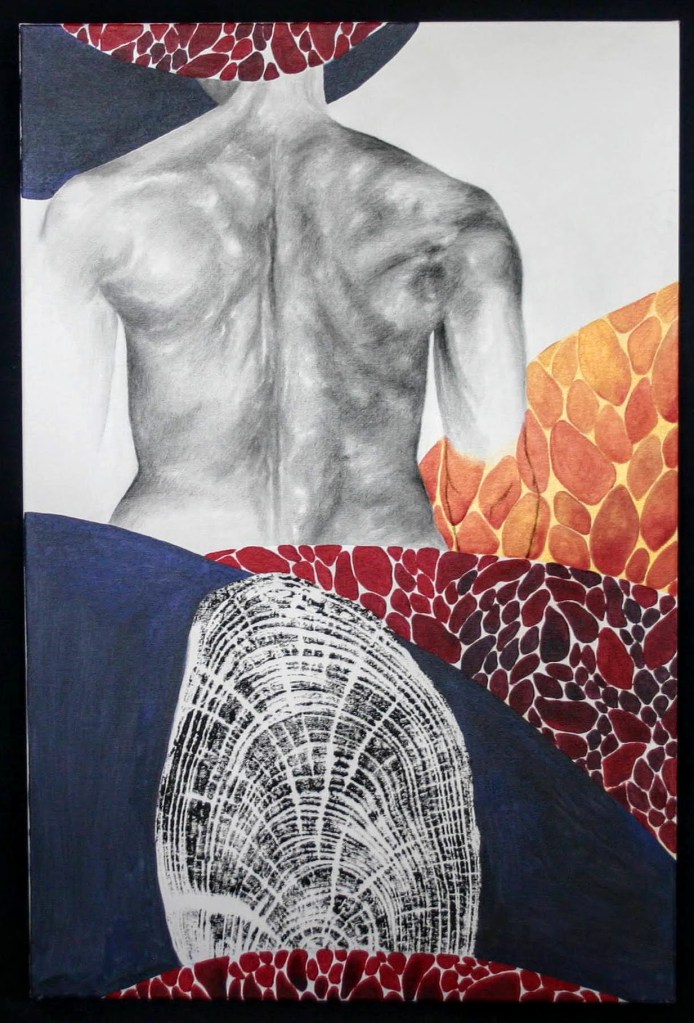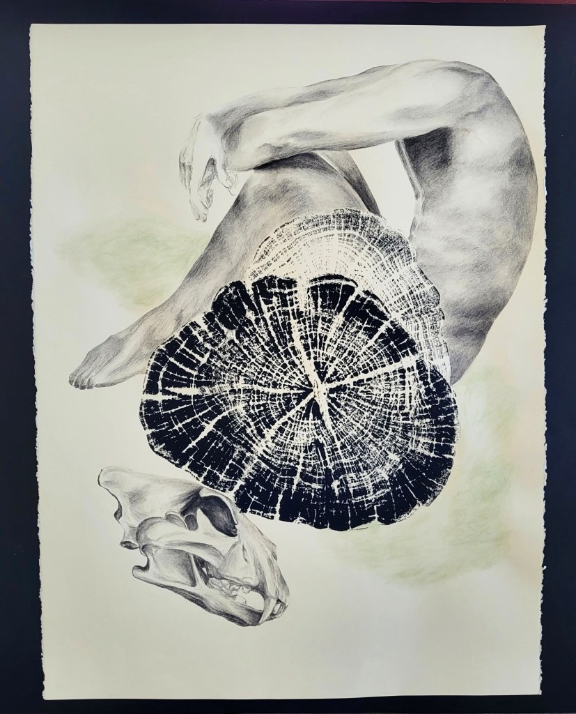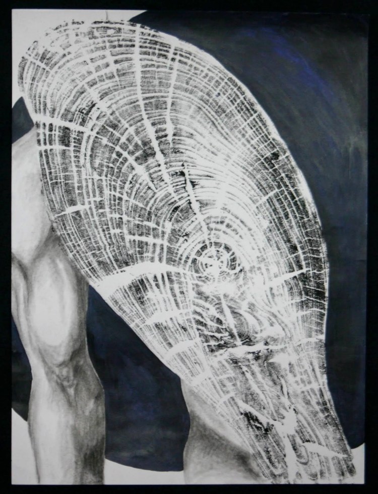 This series, titled driftwood bodies, consists of wood prints, acrylics, and conte, charcoal, and ink drawings on both canvas and paper. The series is ongoing; emerging through and instigated by both the pandemic and escalating climate crisis, it is a study of wood that is broken and carried by water, and the bodies who live as its kin, as well as in and through the environment. It reflects on the complex sensual capacities that human bodies share with other animals, plants, and broader ecosystems. The series is a meditation on our profound interdependence with other creatures and ecosystems, on brokenness and currents, a requiem for time lived without having passed.
