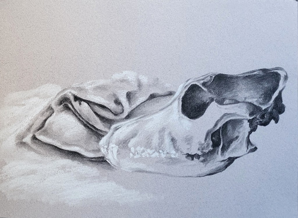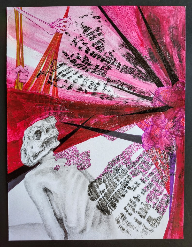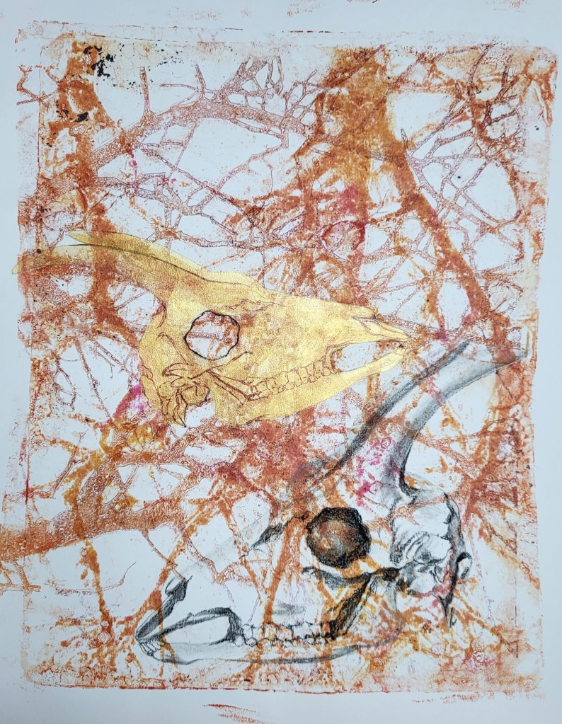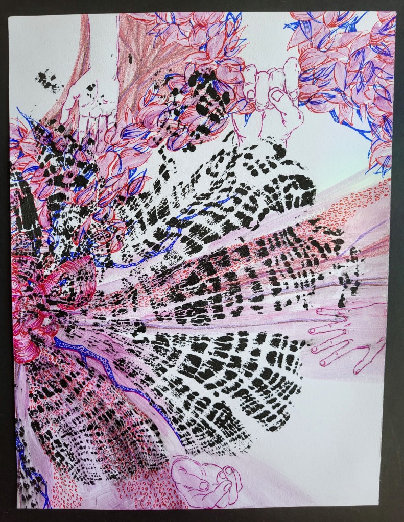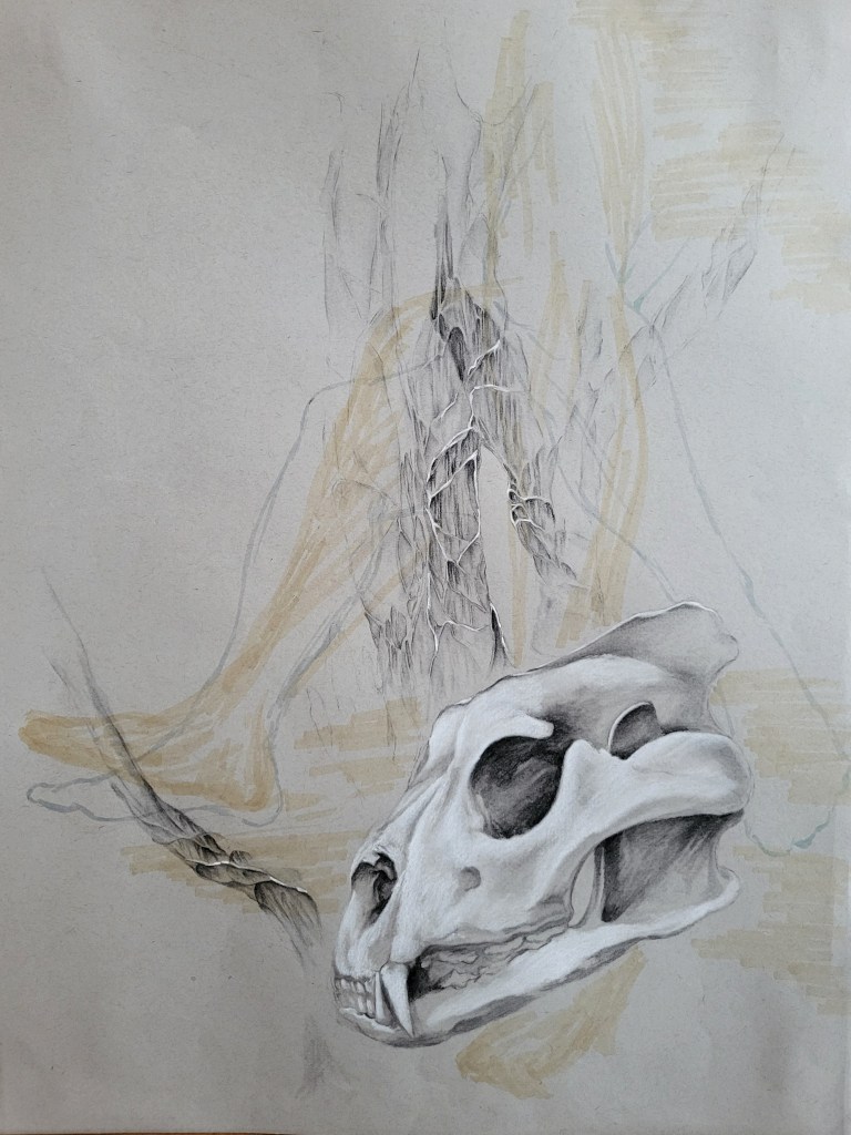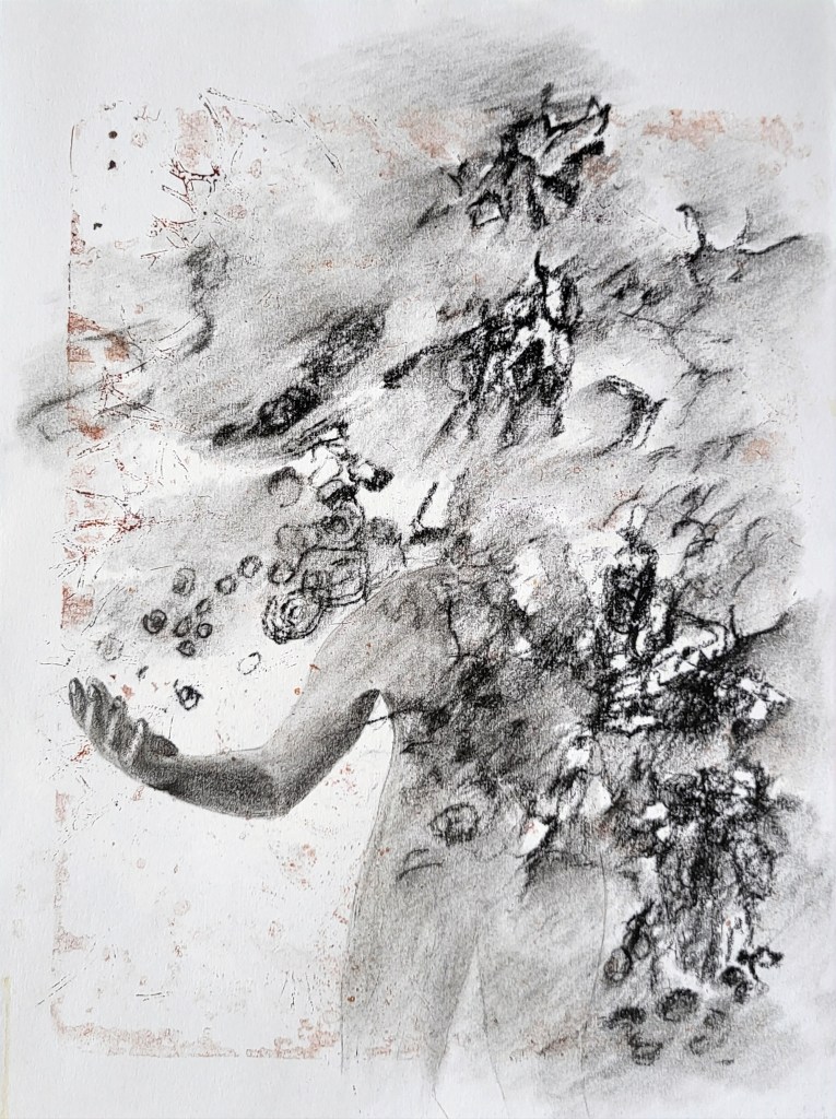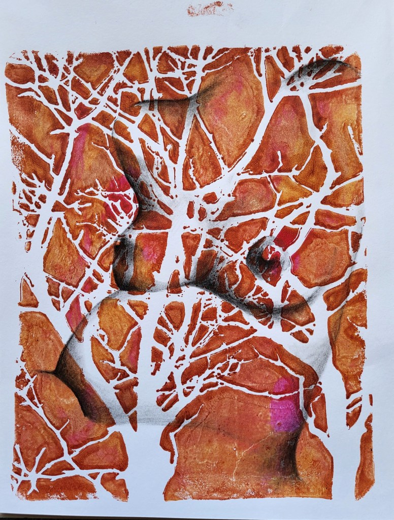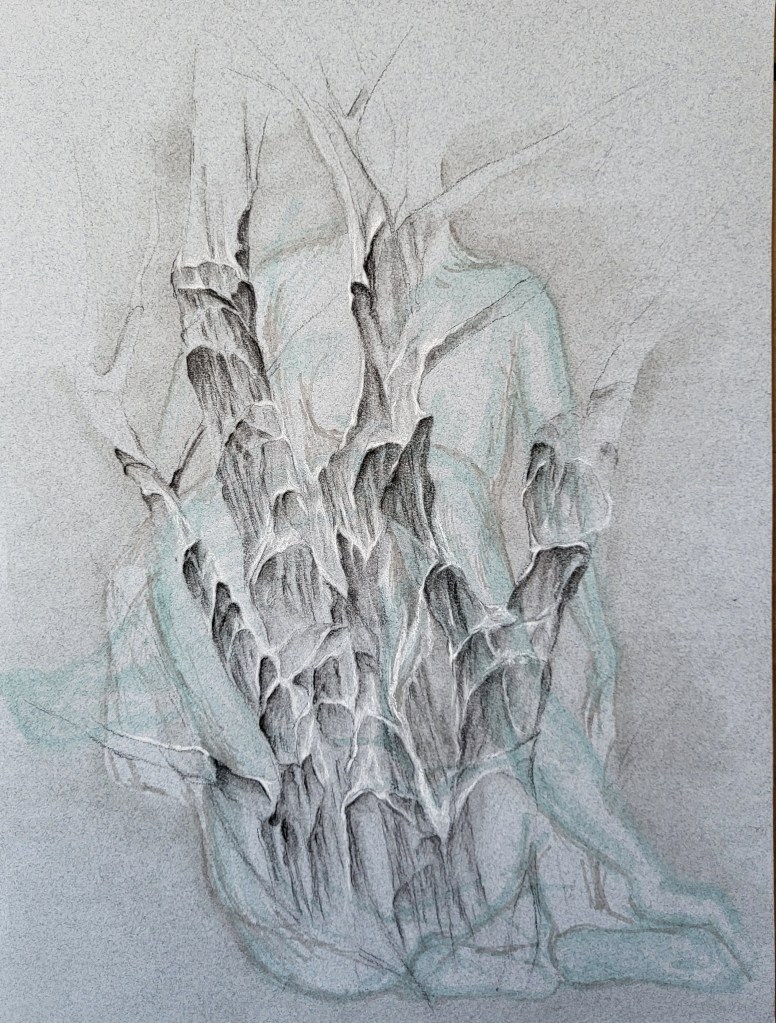 This series, titled driftwood bodies, consists of wood prints, acrylics, and conte, charcoal, and ink drawings on both canvas and paper. The series is ongoing; emerging through and instigated by both the pandemic and escalating climate crisis, it is a study of wood that is broken and carried by water, and the bodies who live as its kin, as well as in and through the environment. It reflects on the complex sensual capacities that human bodies share with other animals, plants, and broader ecosystems. The series is a meditation on our profound interdependence with other creatures and ecosystems, on brokenness and currents, a requiem for time lived without having passed.
